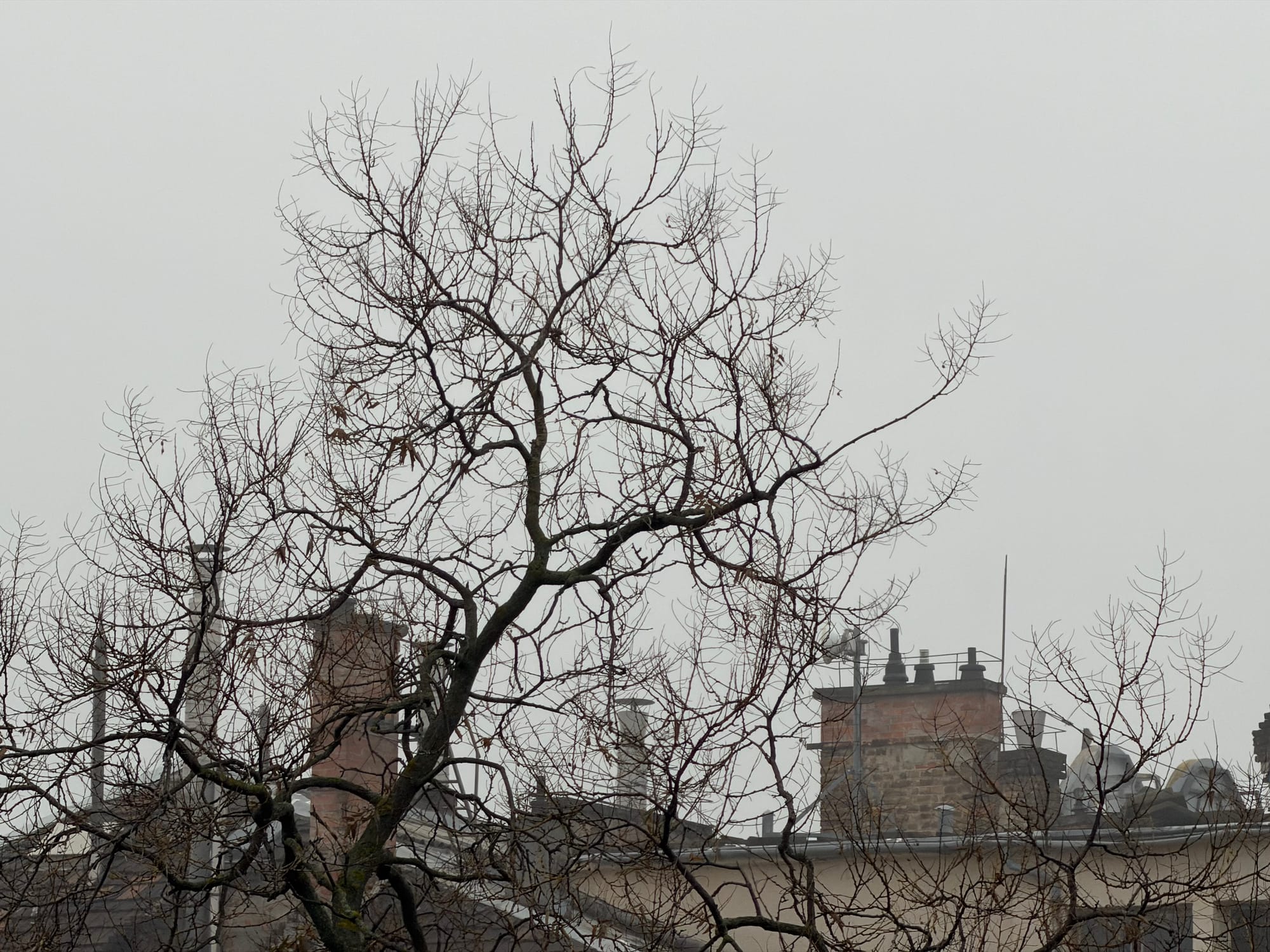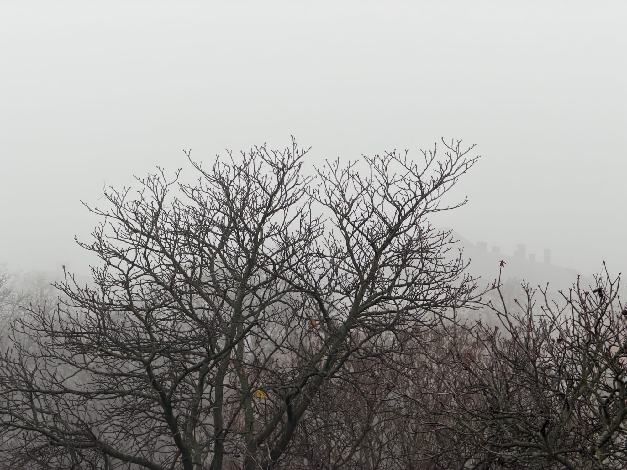 Outside, as the sun rises, somewhere behind this persistent wall of gray that envelops the city, I see this autumn landscape almost turned winter. A state of surrender, suspended. Dendral sticks poking up toward the sky, sprung from branches that seem to reach out from all of the busy reaching just to find a place to poke up their sticks. No point to it now, leaves are all gone, decaying. Their season of duty has passed. This is all just a framework of great potential, standing by until springtime.