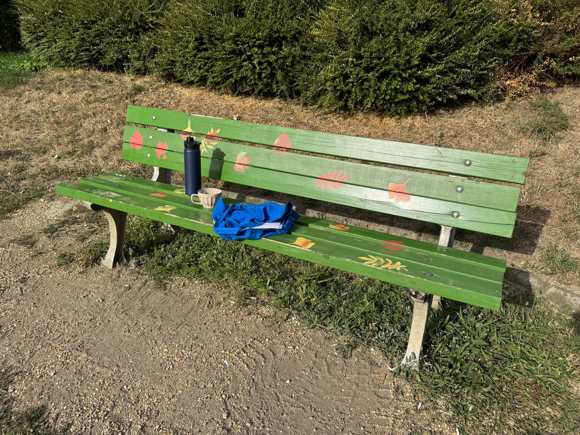 There are many benches from which to choose, with different orientations and different views. There’s a table where one can sit and write comfortably in a notebook and so sometimes I do that, too.