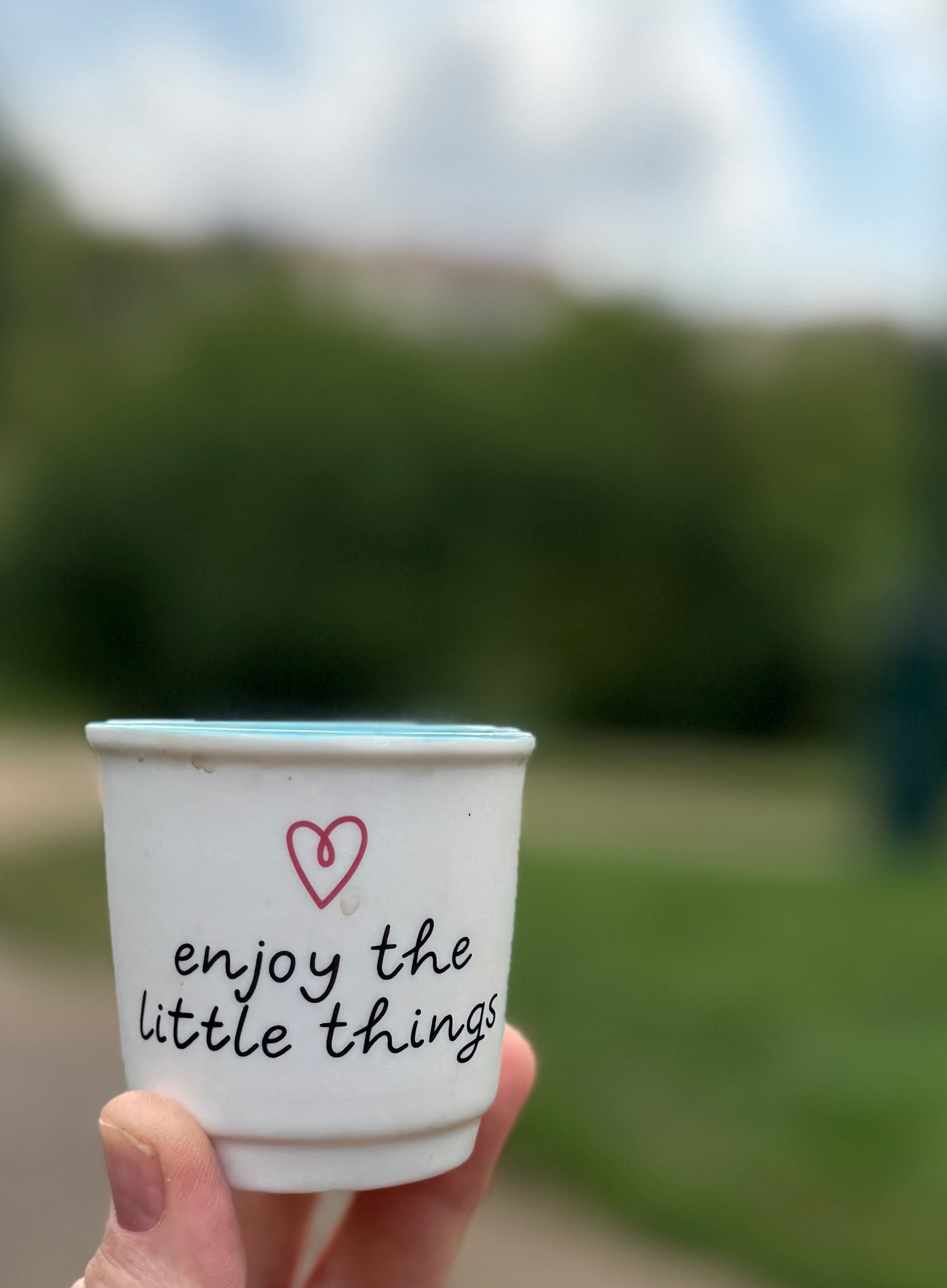 I make my coffee and take it with me and drink it from a little mug, which after a few days I traded for a tiny cup that says this: